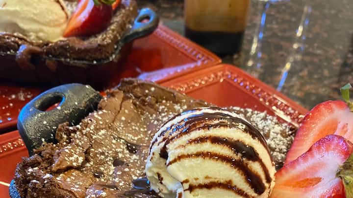 Enjoy a fresh Peach and Arugula Salad to start. Choose one main course from a selection of premium steaks, chicken, or seafood, each paired with exquisite sides. Finish with a decadent dessert like Deep Dish Brownie, Red Velvet Crème Brûlée, or Banana Foster Bread Pudding.