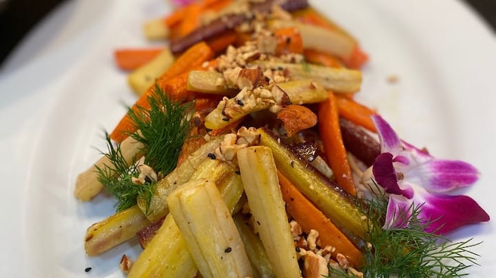 Enjoy a full seafood dining experience with a variety of appetizers including wild mushroom tartlette and crab cakes, followed by a flavorful harvest salad. Choose from roasted Branzino or Rockfish for the main course, and finish with a refreshing peach and basil crisp with vanilla bean ice cream.