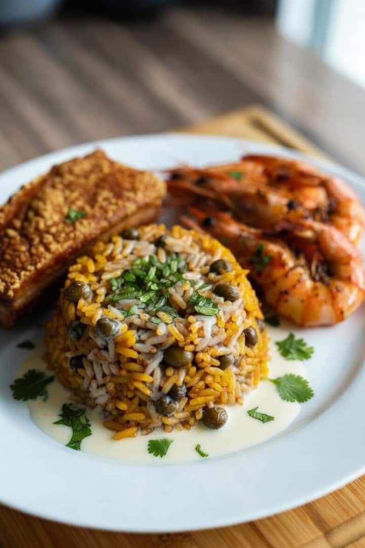 Pork Belly Wrapped & Filled with Sweet Marmalade, Served with Arroz con Gandules (Rice & Pigeon Peas)