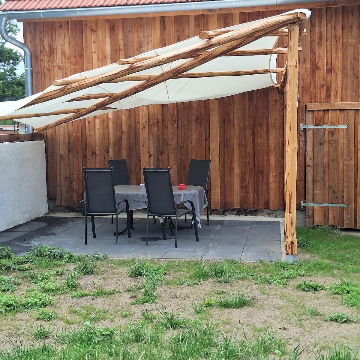 On a hill, nestled by old trees, stands 1 of 3 unconventional huts with 2 beds each. In any weather (except in winter), the cabin can offer camping friends, cyclists or last-minute guests an overnight stay as an alternative to the tent. Just a sleeping bag and a towel in your luggage. The comfort consists of a roof over your head, a place to sleep, a nice campfire and a warm outdoor shower with separate toilet.