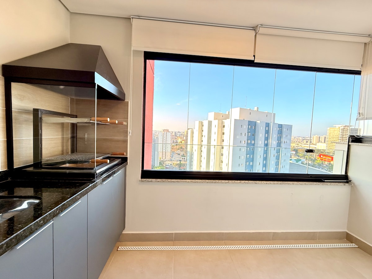 Elegant Flat with excellent location with 2 balconies and 360º panoramic view overlooking Raposo Tavares Highway, 1.4 km from Campolim Park and 3.4 km from Shopping Iguatemi. 1 bedroom, 1 bathroom with hot water with a dining/living room queen bed with bed linen Central location Wi-Fi, TV, air-conditioning, 55" smart TV kitchen with airfyer, cooktop and various kitchen utensils. Flexible check-in Giant balcony with the best sunset in Sorocaba. Perfect for couples or friends"