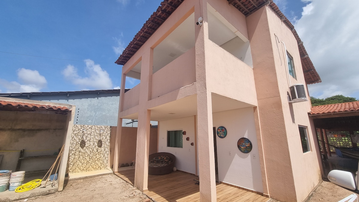 Spacious with ample lawn, 300m from the sea. Ground floor: 1 bedroom-suite, equipped kitchen, living room, bathroom, service area and balconies. Upper floor: access by staircase in airy jatobá by two large panels of cobogós, 3 bedrooms (being 1 suite), social bathroom and a games room/office (with work bench and pantry), which opens to terrace surrounded by long wooden benches. All rooms are air-conditioned.