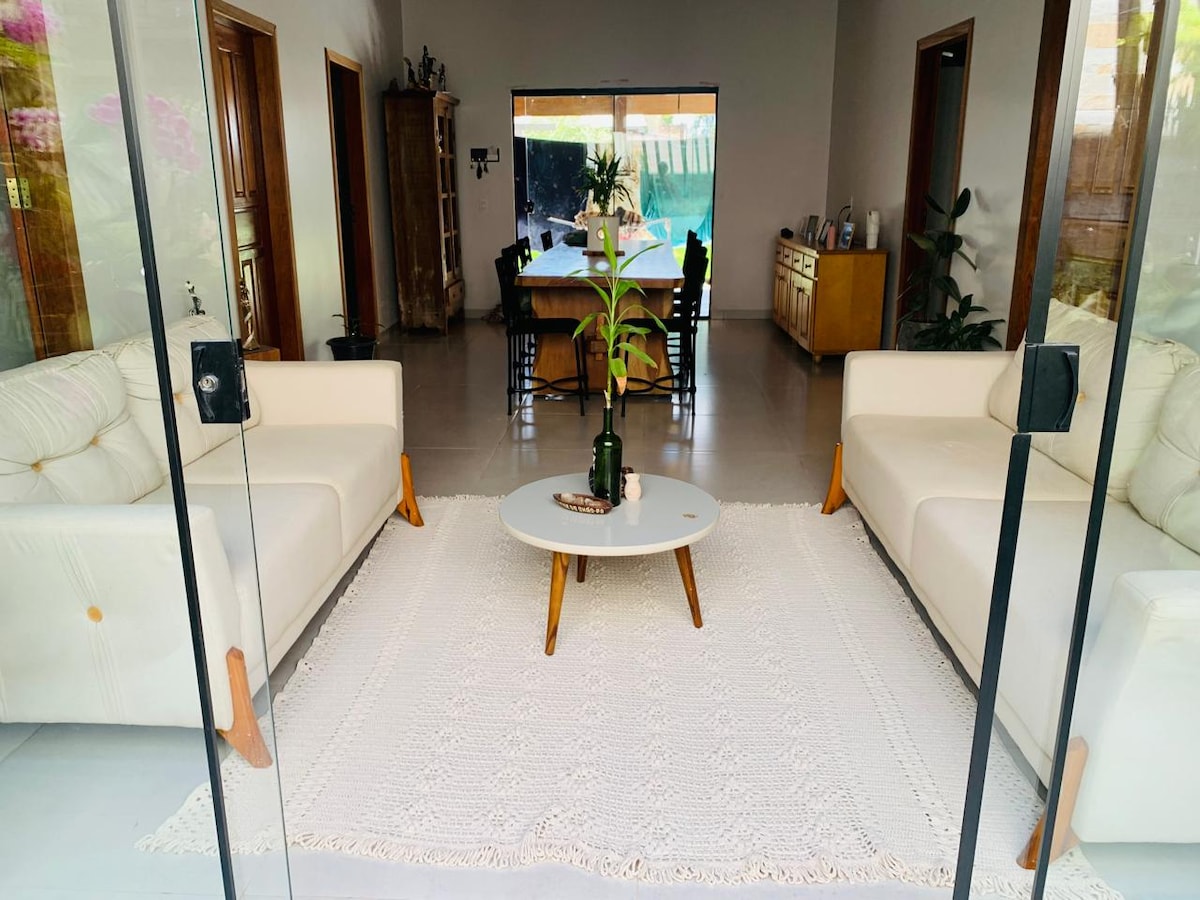 Entire house 3 minutes from the mall and Via Lago. We have 2 bedrooms: One bedroom with air conditioning, TV, 1 double bed; And a bedroom with 1 double bed, wardrobe and fan. Full kitchen, in the bathroom we have the option of hot water, and also an outdoor shower. Wi-Fi, garage, external surveillance camera, electric fence, electric gate, maximum security and convenience. Our Check-in is remote. This gives you more privacy.