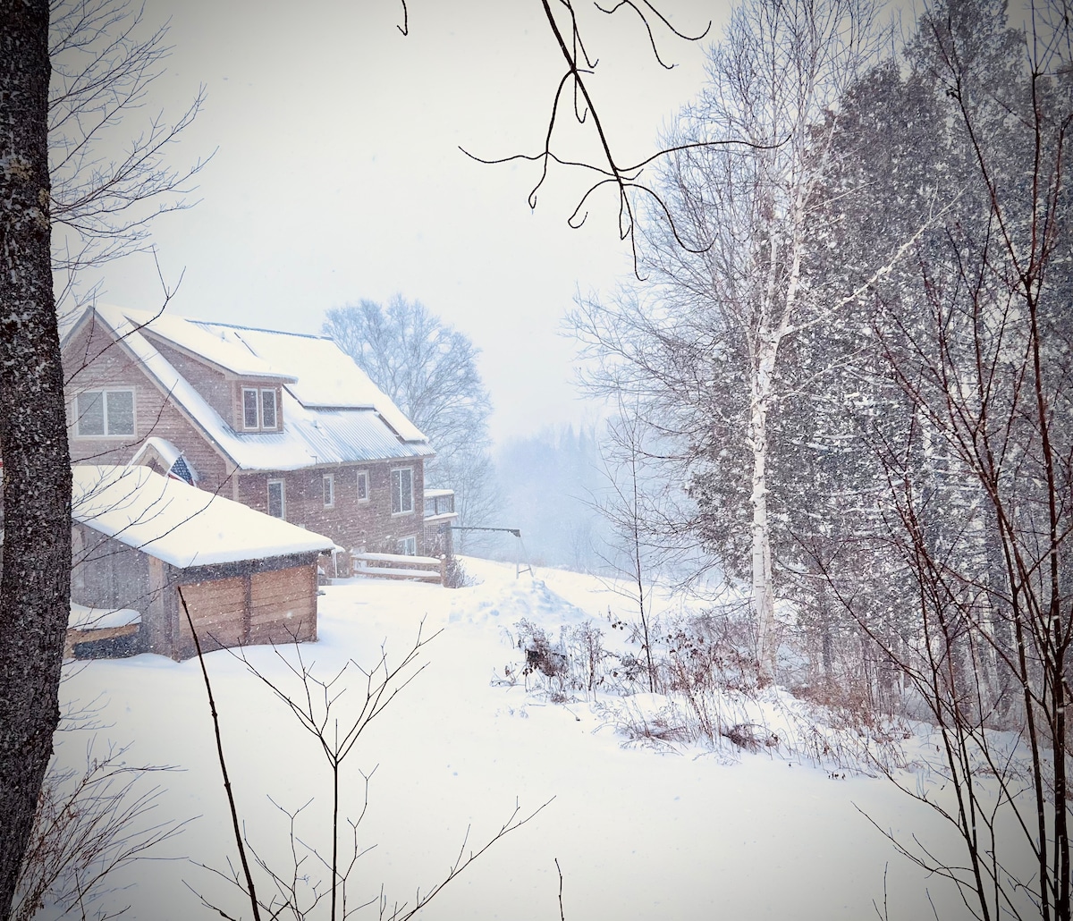 Woodward Haus is a stylish MCM retreat with wood, glass, & stone design. Perfect for remote work, a romantic weekend, a multifamily gathering, a girls' weekend, or retreat. MRV offers all season fun: farmer's market, swimholes, farms, hiking, road & mtn bike, golf, climbing, tubes on the river and lake, can't be beat. The house is nestled in the woods w/ beautiful views mountains. The area's food & breweries, including Lawsons are phenomenal. 1 min to MRG & 14 min to Sugarbush. Exp Wifi