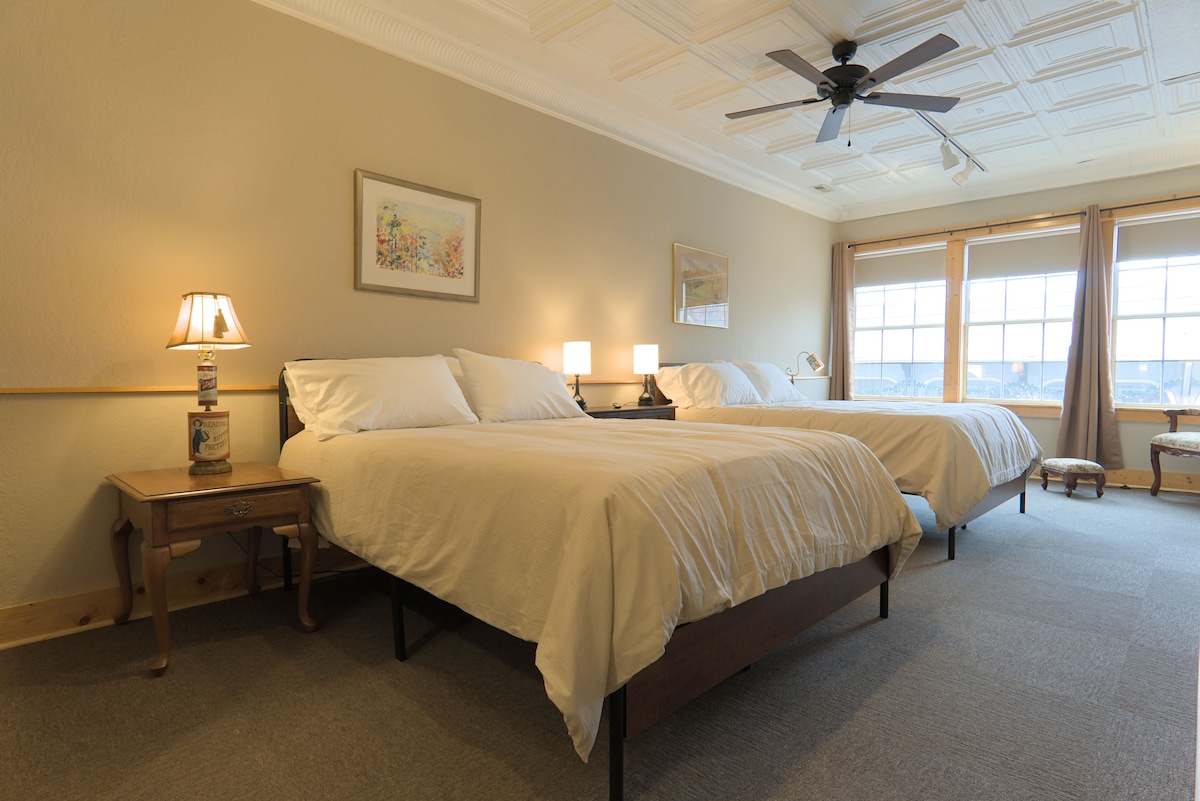 This Suite features a private entrance with patio, full living room with sleeper sofa and half bath, plus an upstairs bedroom with a King size bed with a connecting full bathroom and reading nook. Amenities include a gas fireplace, dry bar, and mini refrigerator in the living room. This suite also includes flatscreen televisions with cable channels in living room and bedroom. Enjoy our outdoor living room and landscaped garden scattered with cozy seating and a fire pit.