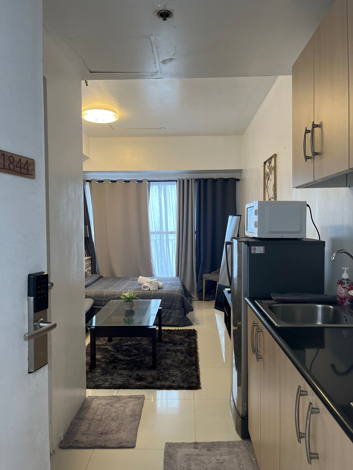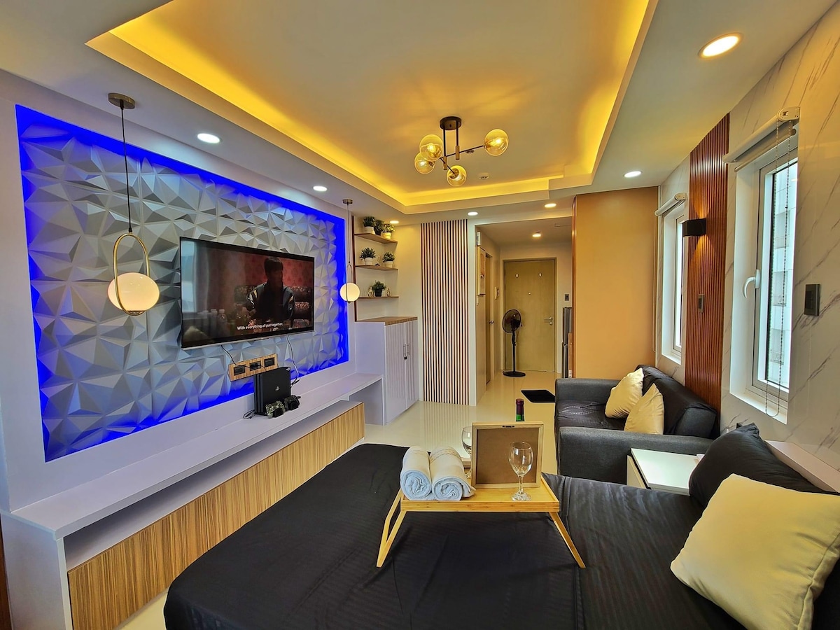 Stay in the center of the action in this one-of-a-kind place. Near to everything that you need. A very nice place to stay, hangout or just chill. * Aircondition * 65-inch TV * Soundbar Speakers w/ Subwoofer * WiFi * Air Purifier * Bed Size Double 54x75 * Pull-out Bed size twin KITCHEN * LG Refrigerator 7cuft. * Induction Cooker * Microwave Oven * Electric Kettle Pots & Pans * Kitchenwares & Utensils * Dinnerware BATHROOM * Single Point Water Heater * Fully Automatic Washing Machine