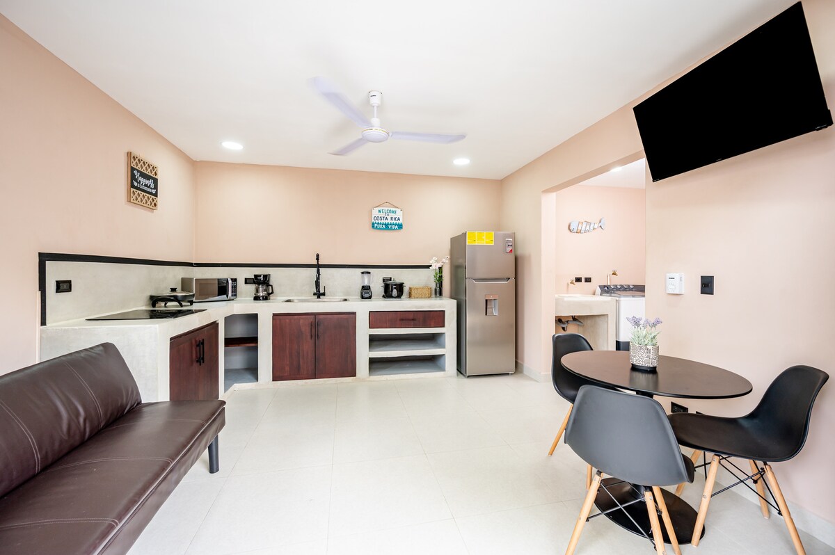 Green Villas is situated at 10 minutes walking to town and 15 to Tamarindo or Langosta beach. This apartment is on the second floor, has 1 bedroom, sofa-bed in living room w/AC, 1 bathroom, fully equipped kitchen, towels, WiFi, and parking. It’s a private and quiet area with 8 complex apartments that share a beautiful large common pool, gazebo and BBQ area Also, is close to supermarket, pharmacy, restaurants, souvenirs and among others, at the same time we are far from the noise.