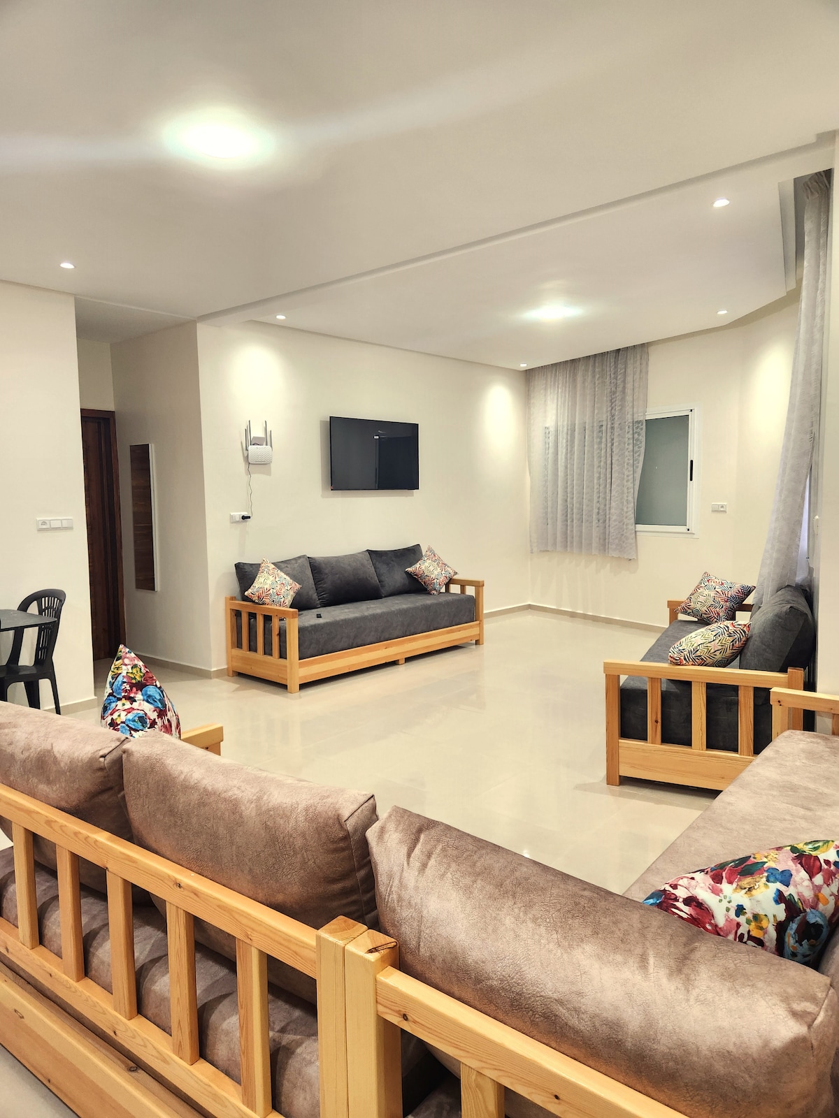 Relax with the whole family at this peaceful two Bedroom Apartment, Located in a gated community in Taghazout Bay . The apartment is on the 2nd floor with golf & Ocean view . Located within 4 min walk to the beach. Golf clubs, Wi-Fi & Netflix included. We can arrange transportation with a 3rd party from and to the Airport.