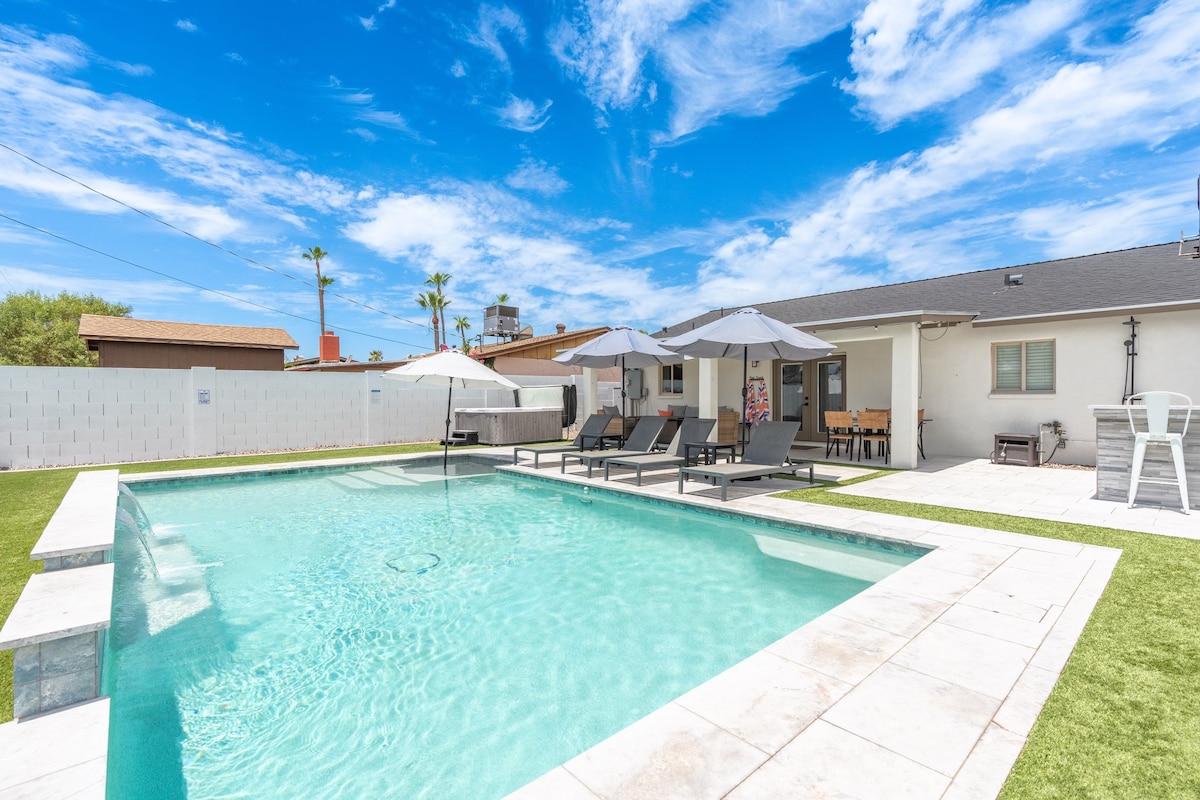 Discover the pinnacle of Tempe's luxury living in this exquisite 3-bed, 2-bath, 1,660 sq. ft haven. Recently remodeled, it features chic interiors with a billiards table, 58' inch Smart TVs, & a modern kitchen with stainless steel appliances. Outside, indulge in the self-cleaning saltwater pool, hot tub, & a full motion patio Smart TV. With its convenient location, just a short 10-min drive to the airport, exploring Tempe and Scottsdale's attractions is effortless from this central retreat.