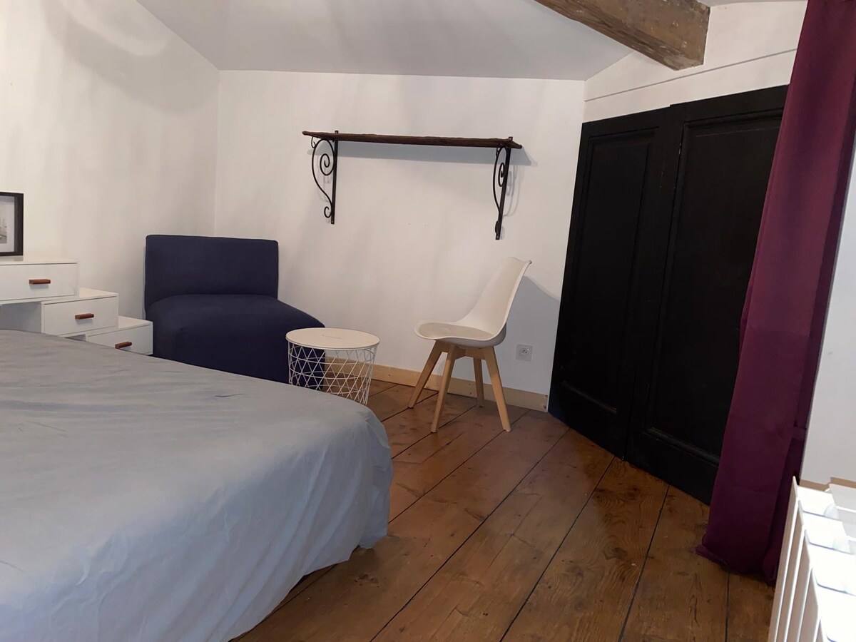 Come and enjoy a quiet pose in our 100 m2 barn adjoining the main house on a private wooded property. On one level, a kitchen/dining room followed by an extensive lounge overlooking a winter garden and then a tree-lined terrace. Upstairs, a large bedroom with a double bed, bathroom and dressing room. Secure parking on the property. 20 km from Lyon, 15 km from Vienna, 24 km from EUREXPO, access to major roads is very fast. Looking forward to welcoming you.