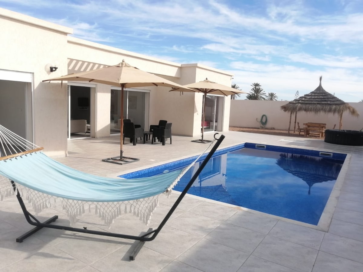 đđïŒïžVILLA OUMAYMAïŒ ïž đđđthis magnificent floor plan villa located in a residential and quiet area in the center of Tezdaine Consists of an open plan kitchen, shower room, 2 bedrooms 1 master suite Pool not overlooked 9 m/4 m paddling pool 4 m/4 m Carport Shower Trampoline and outdoor toilet Roadside BBQ Benchy Good Neighborhood Well located 3 minutes to the most beautiful beach in the island of Djerba saguia and yati Convenience store 5 min from midoun center