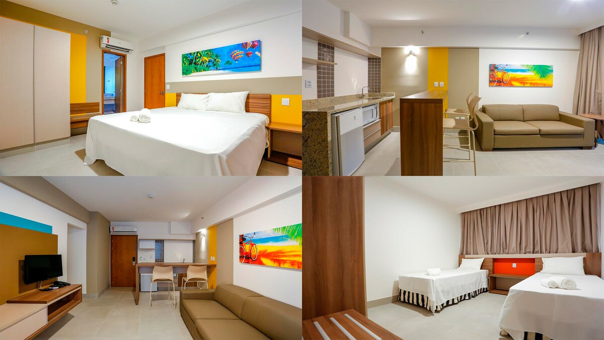 Flat com 1 quarto sendo 1 cama de casal e 1 de solteiro. 1 banheiro. Sala conjugada(1 sofá cama). Mini cozinha com pia, mesa, microondas e frigobar. 1 varanda com mesa. obs: Não possui utensílios de cozinha, mas pode ser levado. A voltagem é 220 w.