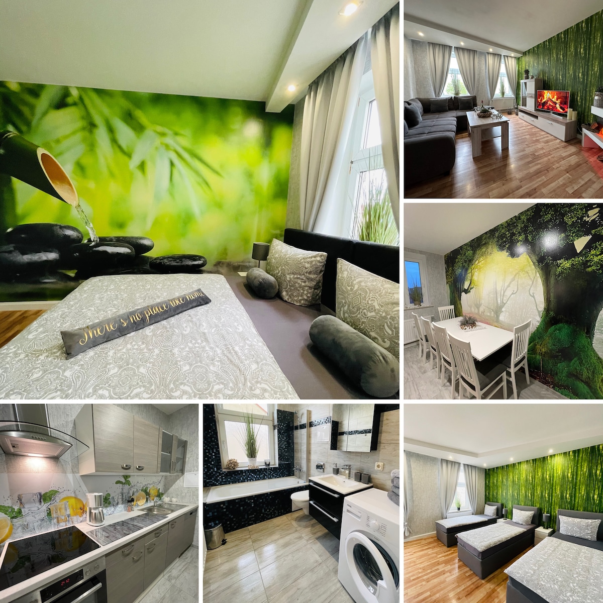 Salve! Our charming 3-room apartment on the first floor is located directly in the classic city of Weimar and can accommodate up to 6 people, as well as a private parking space. The apartment has two bedrooms with large 1.80 m x 2.00 m box spring beds and its own smart TV. In the living and dining area, the couch can also be pulled out and used by two other people to sleep. Furthermore, our apartment has a fully equipped kitchen and a bathroom with shower.