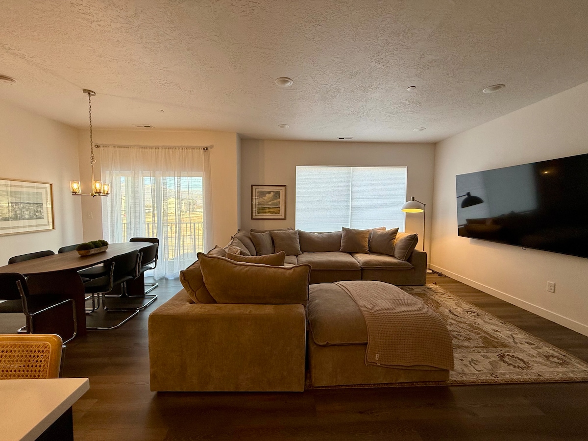 Hot Tub and Patio Theater Room Kitchen Fire Pit BBQ Views This suite is a destination in and of itself. It is located in the beautiful mountain valley of Heber City and is surrounded by open fields on two sides. Relax in the private hot tub, unwind in the theater room, or enjoy stunning views of the surrounding mountains. Conveniently located 20 minutes from Park City and Sundance. Enjoy nearby ski resorts, lakes, golf courses, cross-country skiing, snowmobiling, hiking, fishing, and more.