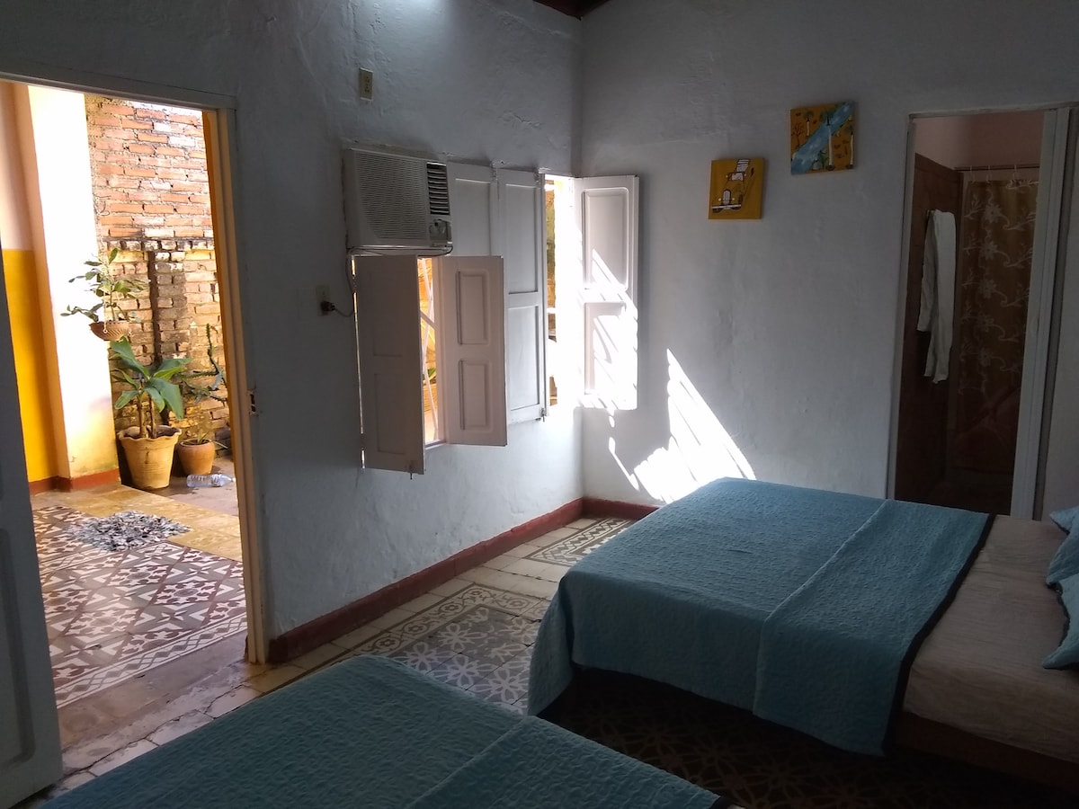 Te gustara mi casa por su estilo colonial y la amplitud de sus terrazas con arboledas , jardines y espacios con ambientes naturales propicio para todo tipo de huéspedes incluyendo niños . Su casa cuenta con ENTRADA INDEPENDIENTE una habitación con capacidad para 5 personas, posee baño privado, con agua fría y caliente, aire acondicionado y minibar. Está a solo tres cuadras del parque central de Trinidad, con acceso a punto wifi y a las principales tiendas.Seran recibidos con un coctel de bienvenida.