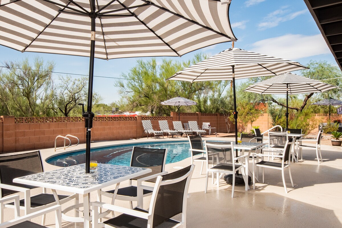 Welcome to our luxurious 5-bedroom, 3.5-bath GETAWAY nestled in the Catalina Foothills! 5 min to scenic hiking in Sabino Canyon, 20 min to U of Arizona and downtown Tucson's vibrant food and nightlife scene. Key Amenities: -Pool (heated for $60/day) -Hot Tub -Game Room w/ Pool Table & Arcade Games -Indoor Fireplace -Outdoor Projector -Pickleball/Basketball Court -Fire Pit -Gas Grill -Corn-Hole -RV Parking Electrical Hookup -Family Friendly (Pack&Play, high chair, bottle warmer) -Workspace/desk