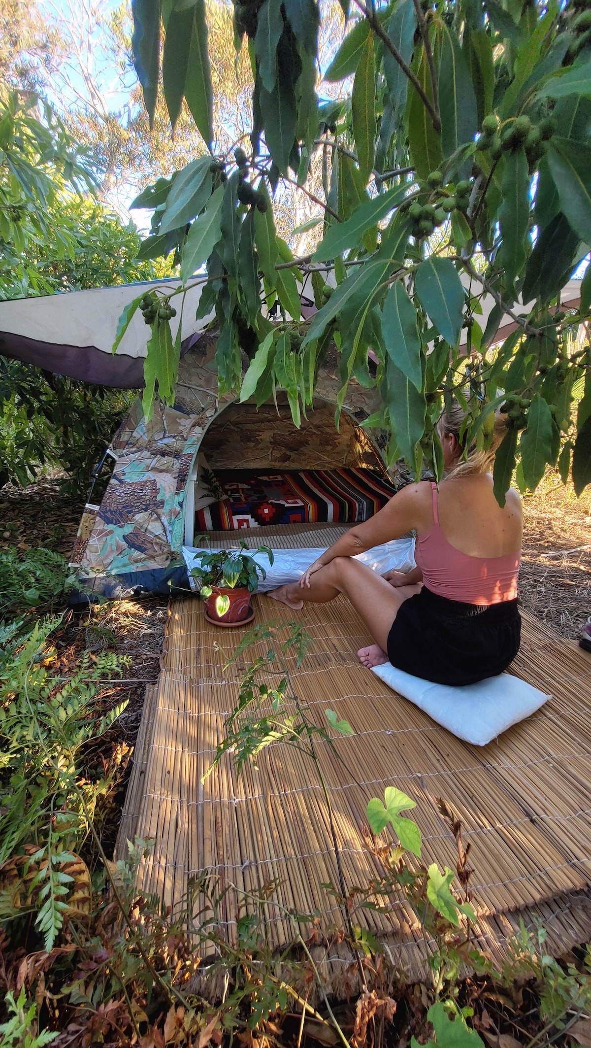 Very green, sounds of birds, light bugs, visiting horses, curious wild chickens... The space is very large, a lot of garden and open spaces. Native trees, a stream of water, ferns... many spaces to rest, grass in the sunlight, a campfire under the stars... The space is shared with the host and the two local mascots, Mambo and Lima.