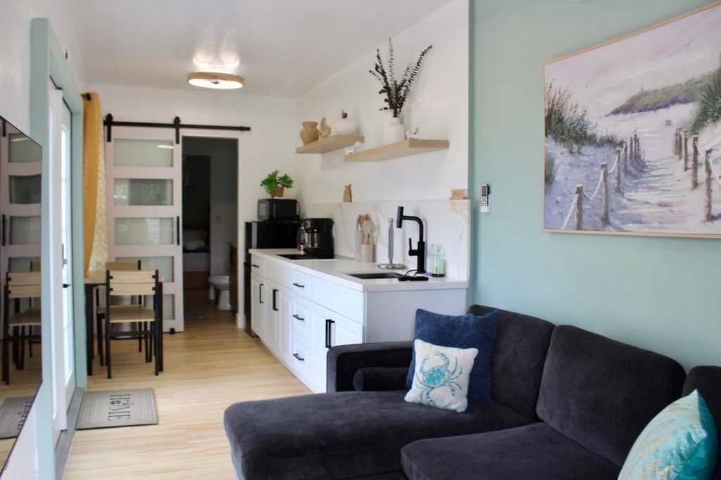 Escape to this cozy, coastal-inspired tiny home — a perfect retreat for solo travelers or couples. Enjoy a comfy queen bed, modern kitchenette, and full bathroom, all thoughtfully arranged for comfort and style. Step onto your private deck for morning coffee or sunset relaxation. Whether you’re exploring the nearby coast or simply unwinding, this tiny home offers a charming, memorable stay with everything you need.