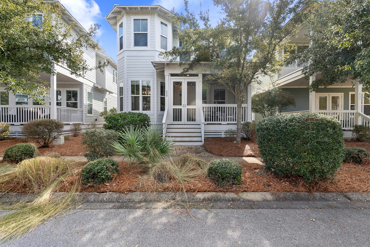 8 minute walk to Ed Walline the most beautiful public beach on the Emerald Coast! Warm up on the sands of 30A enjoying beach life! Safe & peaceful community w/ pool 3 doors down! Walk to nearby restaurants! Run, walk, or ride bikes on the 19 mile 30A path Vaulted ceilings / open floor plan / beautiful rooms Features: Amazing natural light, 4 smart TV's, fast WiFi, Stocked kitchen / new appliances, Washer/Dryer, Weber Grill (BYOC), 4 beach bikes, 4 beach chairs, umbrella, beach towels & more!