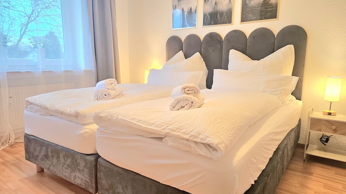 NovaCasa: Stylish 3-room apartment in Lünen. Ideal for business travelers, contractors, and families. Enjoy comfort, peace, and privacy. HIGHLIGHTS: 3 ROOMS: Two separate bedrooms with high-quality hotel beds and Smart-TV + living room with a comfortable sofa bed and Smart-TV. FULLY EQUIPPED: Modern kitchen, balcony, high-speed Wi-Fi. PARKING: Private garage included. LOCATION: Close to Seepark Lünen and the canal. We guarantee the highest standards of hygiene and quality.