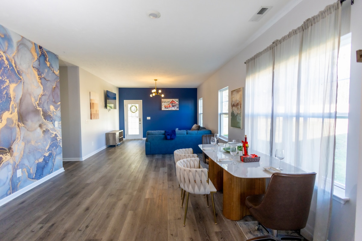 Beautiful modern home in a quiet neighborhood but very close to Interstate 24, shopping center, movie theater, restaurants, and supermarkets. Located 25 minutes from downtown Nashville, 20 minutes from Murfreesboro, and 20 from Nashville airport. Open kitchen and dining room, spacious living room with 65-inch smart TV, and laundry room with Brand New large washer/dryer. Loft with daybed, smart TV, chairs, and foosball table. Outside Covered patio with privacy fence.