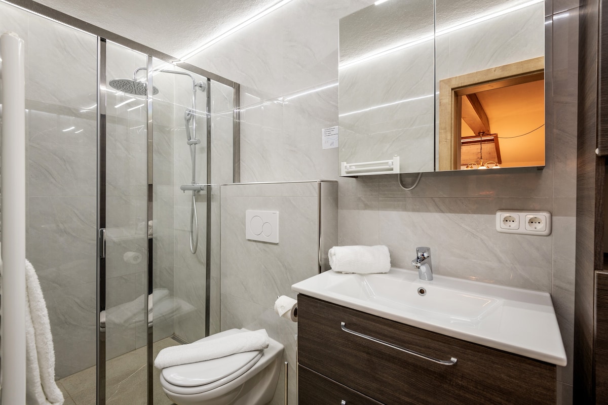 Soak into the history of this special and memorable place to stay. Have you ever slept like a prince under the roof in a real castle? Here, traditional craftsmanship meets modern architecture and incomparable living comfort. - Accessible for 2 people - Elevator is available - 1 triple room (double room with folding bed) - Bathroom (accessible) - Kitchen-living room with sofa (folding bed 160x200 cm) - Sophisticated light architecture - Hand-tanched solid wood furniture