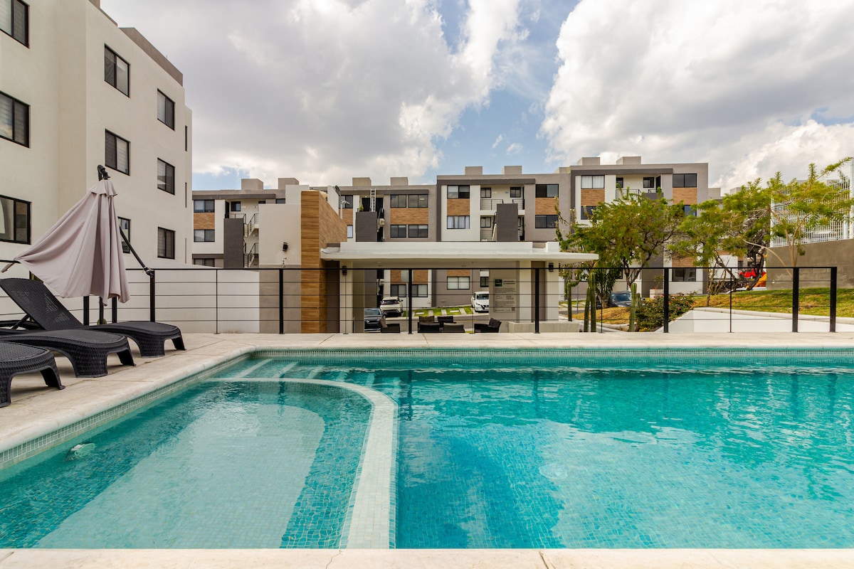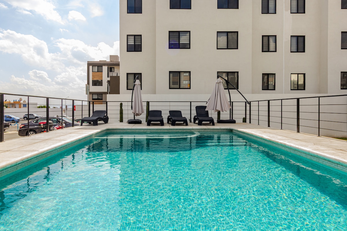 "LA GOTA" BUILDING between Plaza del Parque and Plaza Boulevares Private terrace, with table and 8 chairs High-speed WiFi SmartTV (Roku) in the living room and master bedroom Comfortable desk with contacts and USB port in case you need to work Kitchen with stove, microwave, refrigerator, blender, coffee maker, dishes, kitchen utensils and 5-stage water purifier Washer and dryer Entrance with digital locks, enter and exit when needed Pets are prohibited