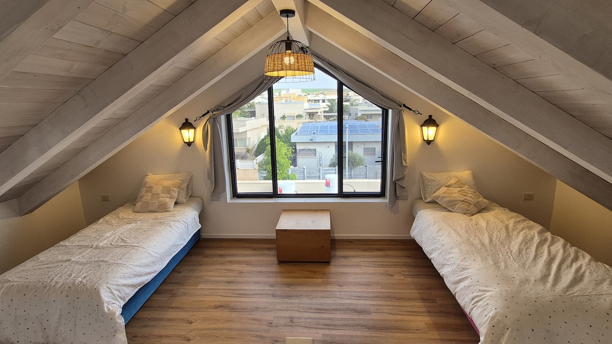 A charming guest unit in Kibbutz Hamadia in Emek HaMa'ayanot. A short drive from all the springs and attractions in the valley and about 20 minutes from the Sea of Galilee On the ground floor is a living room with a spacious sofa that opens up to an extra double bed, a dining area, a fully equipped kitchen that includes a water bar and an espresso machine. A spacious and luxurious shower. On the second floor is a double bedroom with a view of Gilboa. A pleasant and well-kept private courtyard that includes a seating area. Free parking near the unit. In the locality, a local grocery store is just steps away